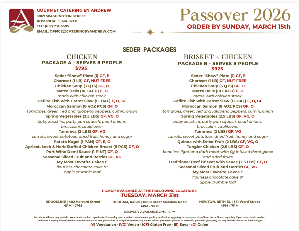 Orders for first days of Passover must be placed by Sunday, March 15th by 4pm for pickup or delivery on Tuesday March 31st!